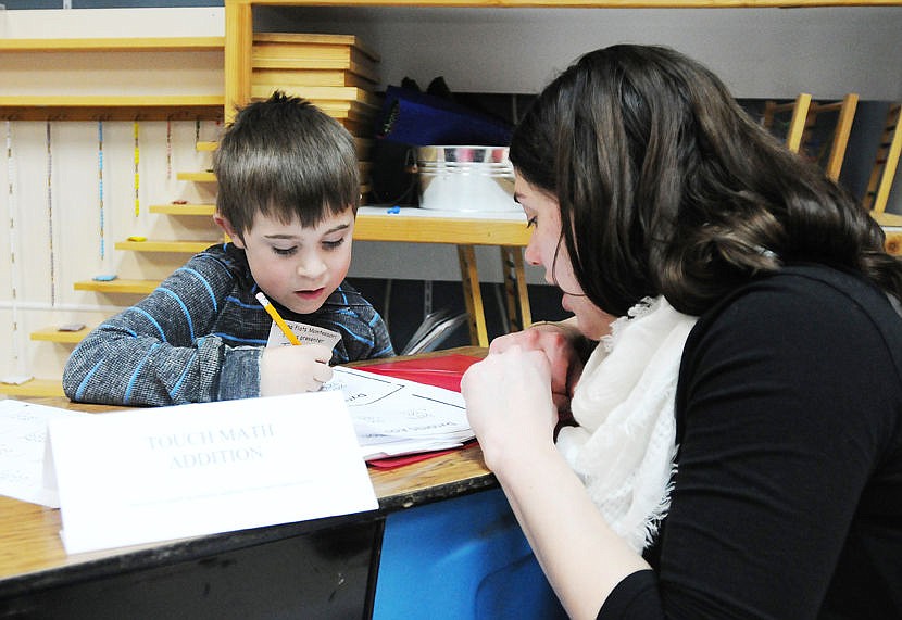 Helena Flat first and second-grade teacher Kami Doty helps second-grader Tavyn Taylor with addition during the Montessori Math Night at the school on Thursday. (Aaric Bryan/Daily Inter Lake)