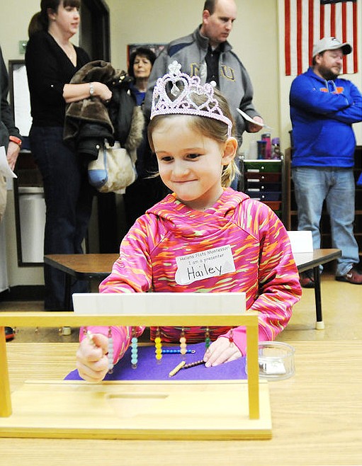 Helena Flats kindergartener Hailey Loomis demonstrates hanging bead stairs during math night at the school. (Aaric Bryan/Daily Inter Lake)