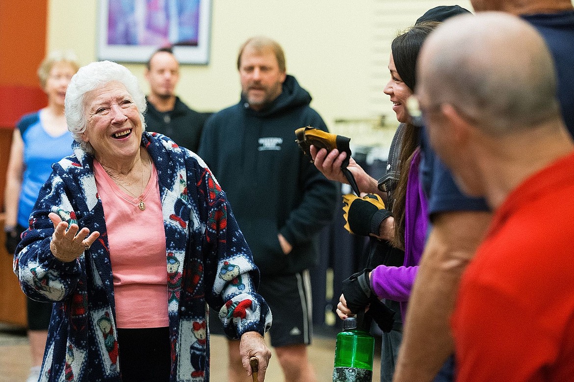 Peak members and staff had birthday cake waiting for Dillman when she arrived in her workout duds. After the singing and photo ops, Dillman quickly ate a small bite of cake before journeying into the exercise area with a cane she needs from having recent surgery.
