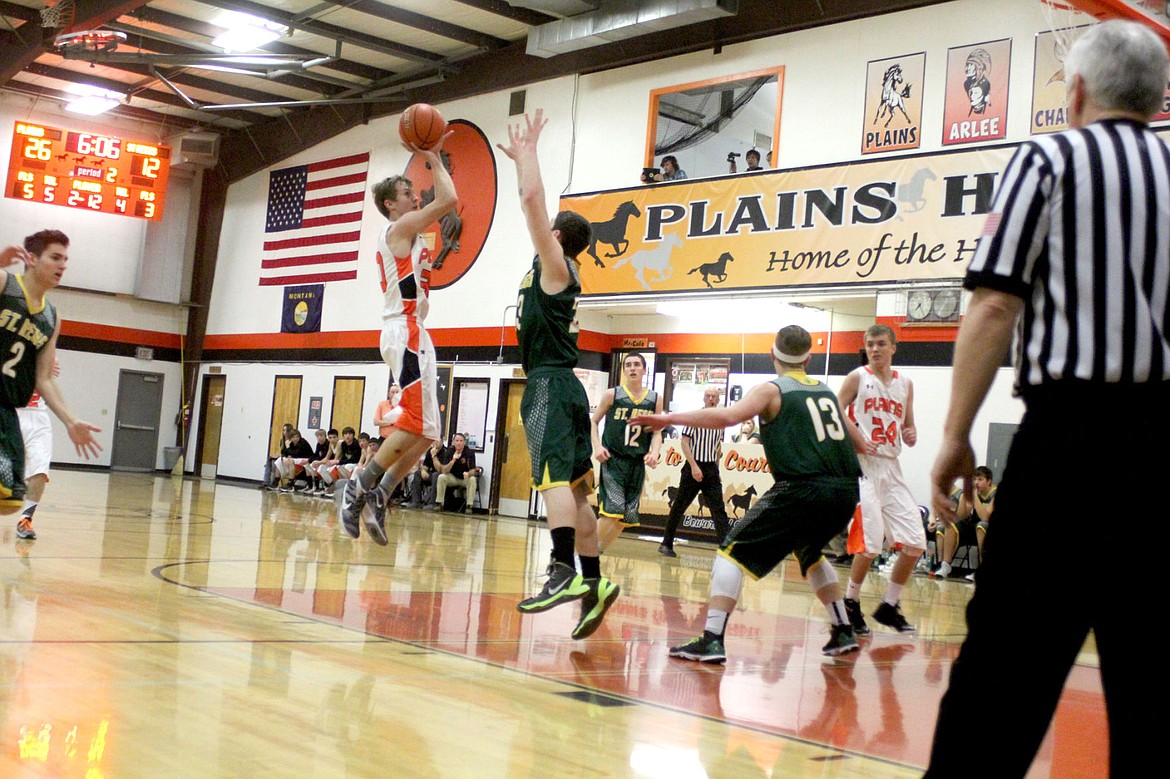 Cole Benson leaps to make a shot past one of St. Regis’ defenders during the Horsemen’s home game.