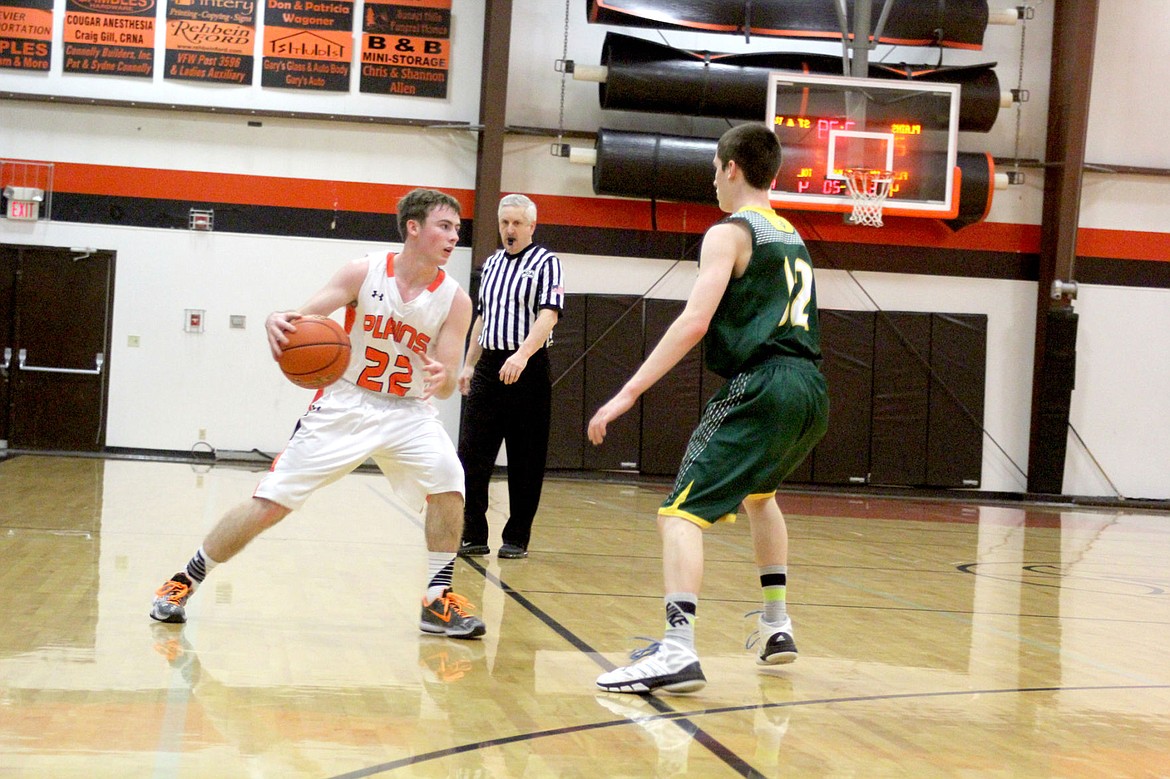 Alec Cole looks for an opening past one of the St. Regis Tigers as he takes the ball down the court.