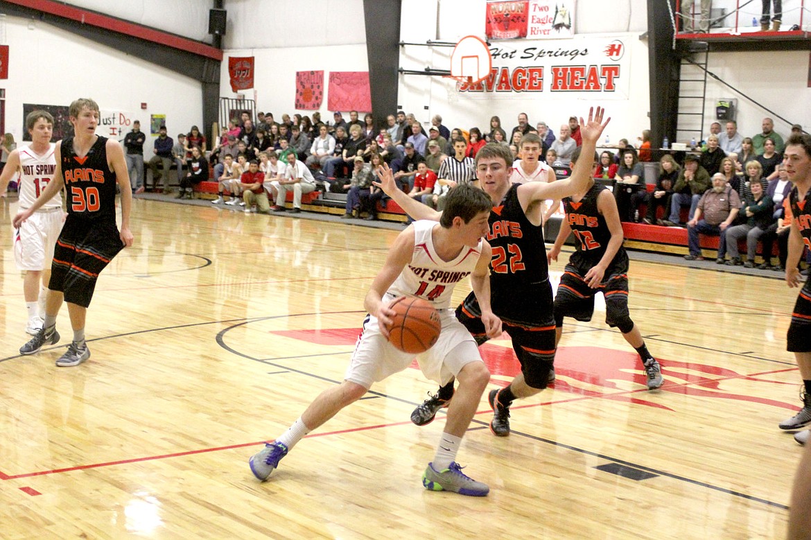 Zach Osborne of Hot Springs pushes past Plains’ Alec Cole during their county rivalry game Saturday evening.