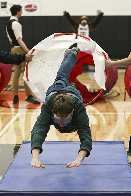 Steve Woll may have had the best part of the show. The boys’ basketball coach and teacher came out in a cape, followed by his son, who played out a Star Wars scene. Just when Woll though he had won, Monte the bear made an entrance, much to the surprise of almost everyone in attendance. Monte whisked away Woll’s son, then treated the crowd to his acrobatic skills.