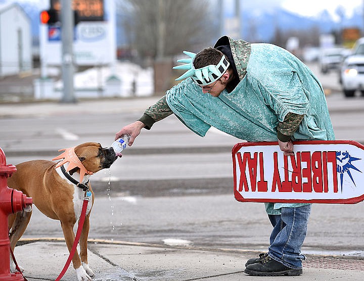 Tyrell Scott of Rollins pauses for a moment from advertising for Liberty Tax to give his dog, Ace, a boxer, a drink of water, on Monday, February 16, at the intersection of Meridian and Idaho in Kalispell. (Brenda Ahearn/Daily Inter Lake)