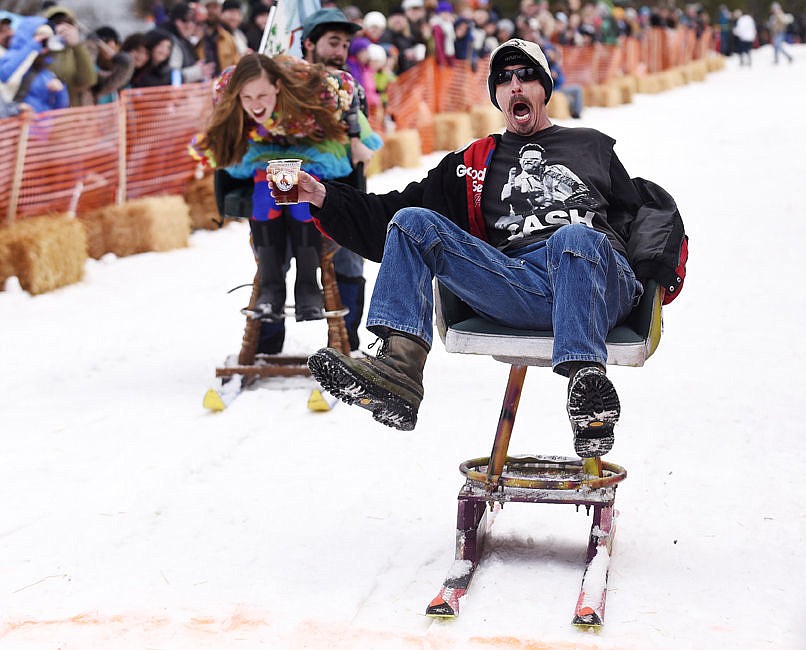 Gary Wallette yells as he crosses the finish line ahead of Jamie Dawson and Tyler McRae during the Cabin Fever Days Barstool Races in Martin City on Saturday. (Aaric Bryan/Daily Inter Lake)