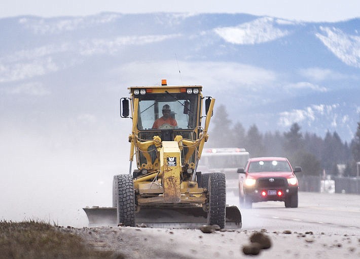 A grader clears the large debris off of the side of U.S. 2 after a gravel spill near the Glacier International Airport on Wednesday. (Aaric Bryan/Daily Inter Lake)