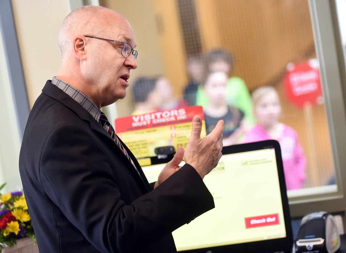 Flathead County Superintendent Mark Flatau discusses the installation and use of the new identification system from Complete Campus Security Solutions at Edgerton Elementary on Tuesday morning, February 9, in Kalispell. (Brenda Ahearn/Daily Inter Lake)