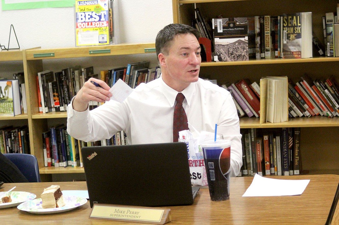 Superintendant Dr. Mike Perry shows a Hot Buck to the school board members as he explains how the student rewards program works.