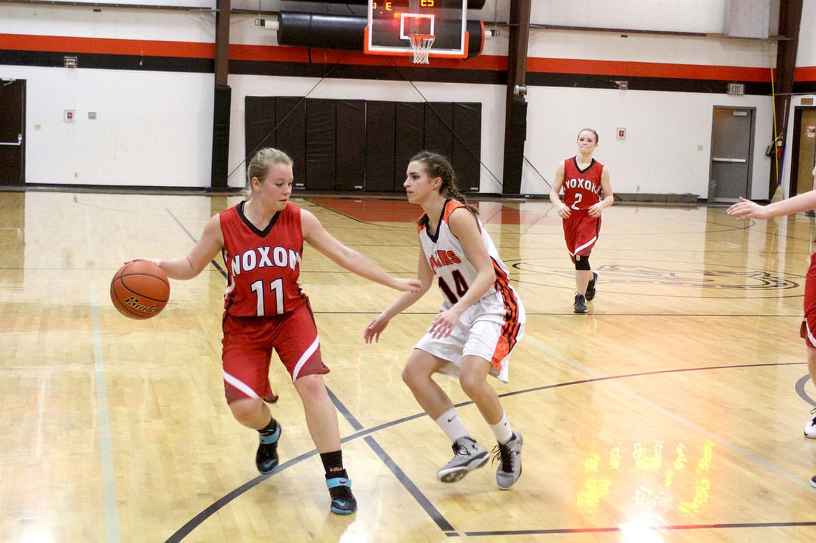 Asiah Jenson looks for an opening to dodge around Sannon Dimond during Noxon’s game against Plains.