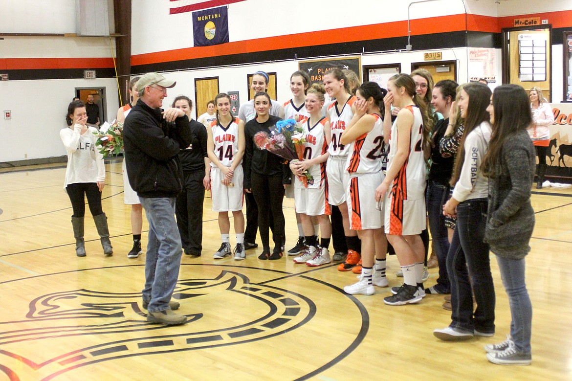 As part of their senior night activities, the members of the Trotters basketball, track and softball teams presented James Cleveland with a jacket for all the work he has done in driving the Plains pep bus to and from games.