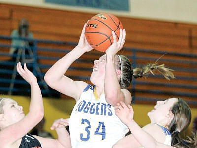 Sophomore Shannon Reny fouled on this attempt, 0 for 2 from the line second quarter vs. Eureka Thursday, Feb. 18 with Amanda Peterson, left, and Jayden Winslow. Libby over Eureka 39-36.