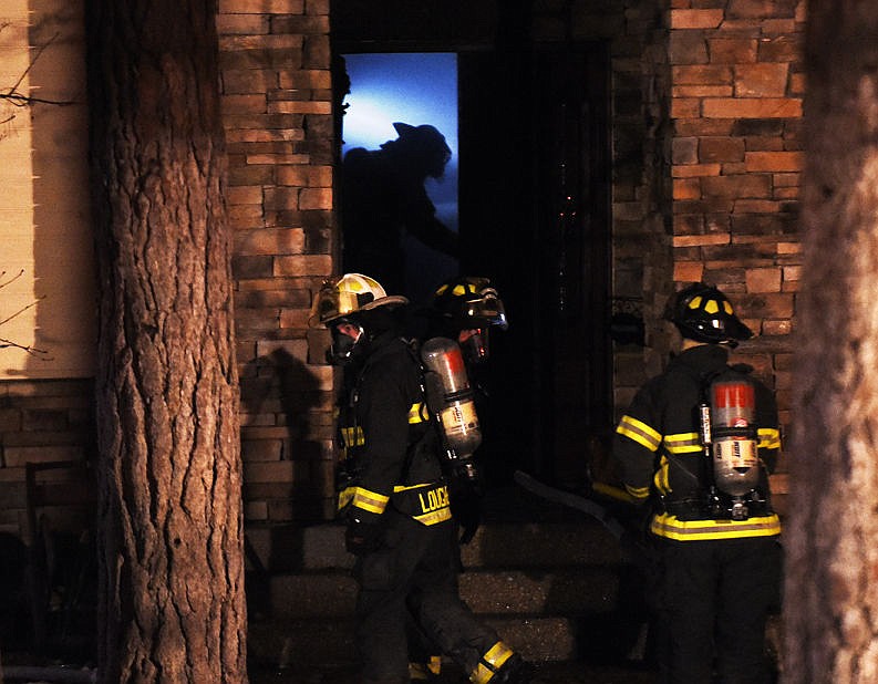 Firefighters enter the home during a house fire on 327 Ponderosa Lane north of Kalispell Friday night. (Aaric Bryan/Daily Inter Lake)