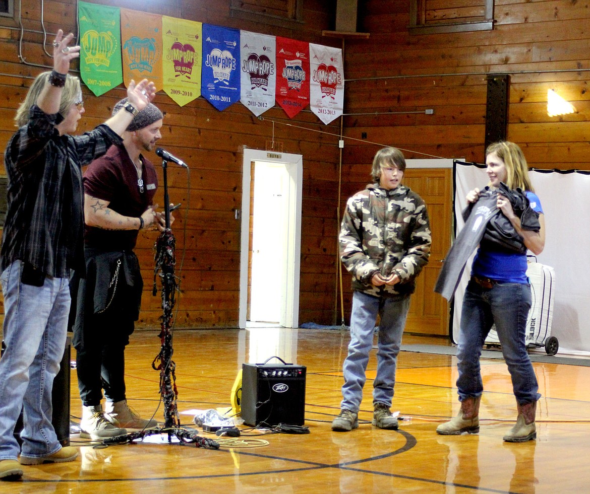 Sixth grader Donald Rosenbach and Tricia Andersen present Jared Blake and Flash with Dixon School shirts in appreciation for their stop in the community.