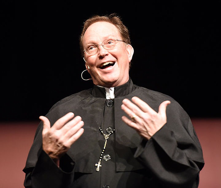 Narrator Tom Hicks as Father Drobney opens the dress rehearsal of Don't Drink the Water by Bigfork Community Players which opens on Friday, February 26. (Brenda Ahearn/Daily Inter Lake)