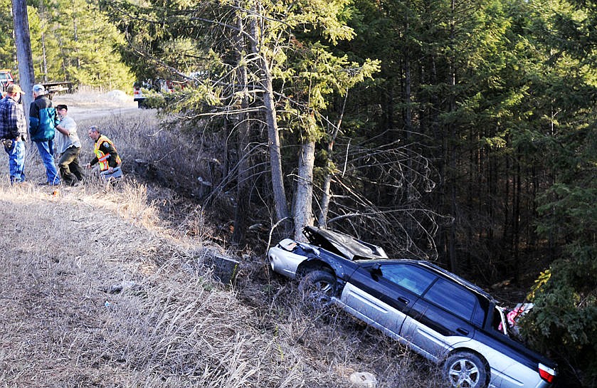 A Subaru sits at the bottom of a hill after running off of Browns Meadow Road in Kila and striking a tree during the one-vehicle accident. The driver, the lone occupant of the car, was airlifted by ALERT to Kalispell Regional Medical Center. (Aaric Bryan/Daily Inter Lake)