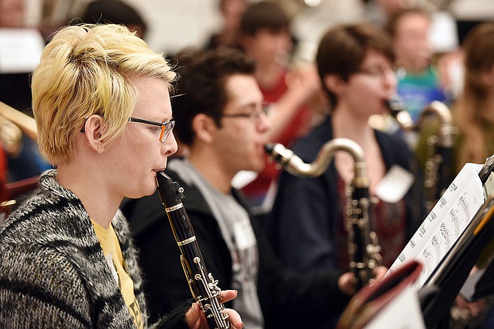 Chandler Middlemas of the Flathead High School Symphonic Band, left to right, and Steeton Wilsonoff and Rachel Schubert of the Hellgate High School Wind Ensemble practice together under the direction of Nathan Stark of Montana State University on Monday, February 29, at Flathead High School. The AA High School Band Festival continues tonight with the Gala Concert at 7:00 p.m. which will feature the Combined School Percussion Ensemble, the Combined Helena Capital and Glacier performance and the Combined Hellgate and Flathead performance. (Brenda Ahearn/Daily Inter Lake)
