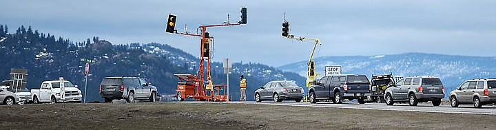 A new traffic light at Stillwater and the entrance to Glacier High School kept traffic flowing on Monday morning, February 29. According to James Mitchell of Montana Department of Transportation another temporary light will be going up at Stillwater and Four Mile Drive, possibly as early as Wednesday. (Brenda Ahearn/Daily Inter Lake)