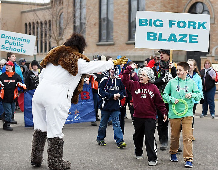 Special Olympics athletes from Bigfork get a high five from a Winter Carnival yeti as they start a parade up Central Avenue in Whitefish on Sunday afternoon. The parade was part of the opening ceremony for the annual Winter Special Olympics. (Brenda Ahearn/Daily Inter Lake)