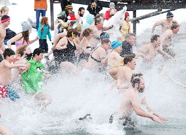 A group of brave plungers rush into Flathead Lake to ring in the new year at The Raven in Woods Bay for the 22nd annual Polar Bear Lung on Friday. (Aaric Bryan/Daily Inter Lake)