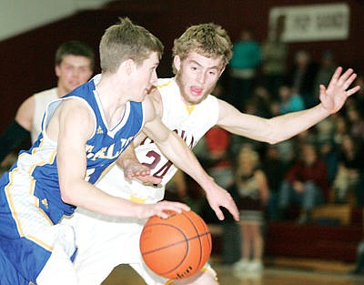 Junior Mason Chapel guarding Tanner Laws in second quarter vs. Thompson Falls Jan. 2, 2016.