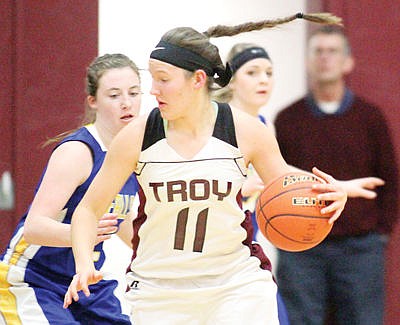 Sophomore Allie Coldwell drives on Gillian Nelson in first quarter vs. Thompson Falls Jan. 2, 2016. (54-41, Troy)