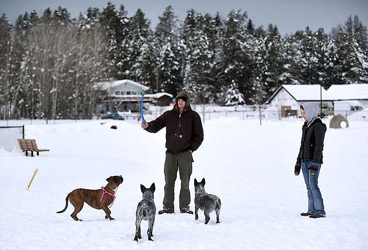 Ryan and Jessica Perkins enjoy a day with their Boxer, Stormy, and Blue Heelers Sweetie and Chief at the Hugh Rogers Wag Park in Whitefish on January 4. (Brenda Ahearn/Daily Inter Lake)