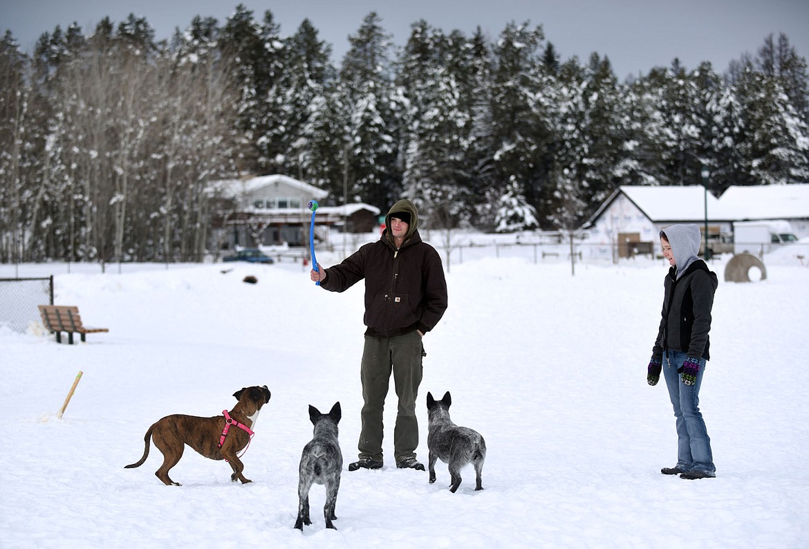 Ryan and Jessica Perkins enjoy a day with their Boxer, Stormy, and Blue Heelers Sweetie and Chief at the Hugh Rogers Wag Park in Whitefish on January 4. (Brenda Ahearn/Daily Inter Lake)