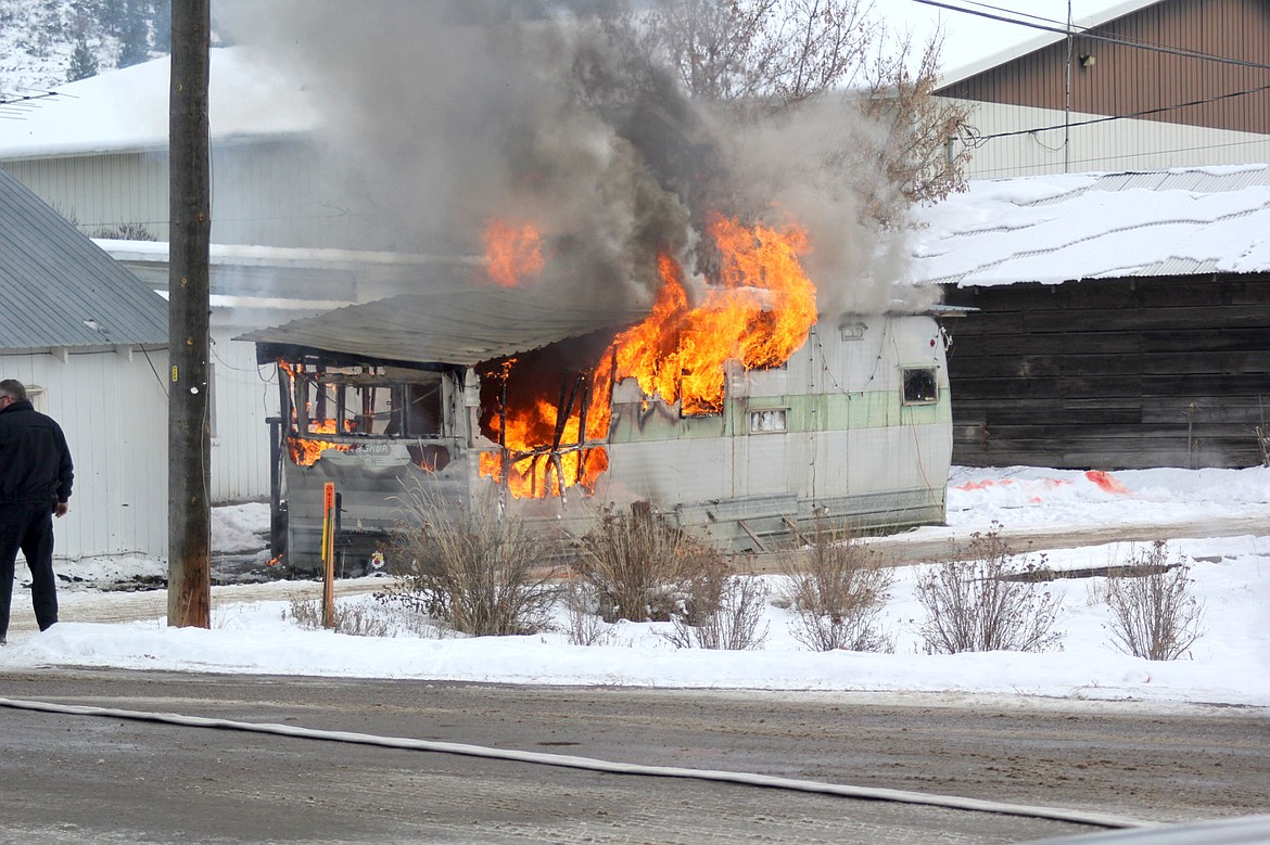 Flames erupt out of holes in a trailer near the Plains VFW as firefighters prepare hoses to combat the fire.