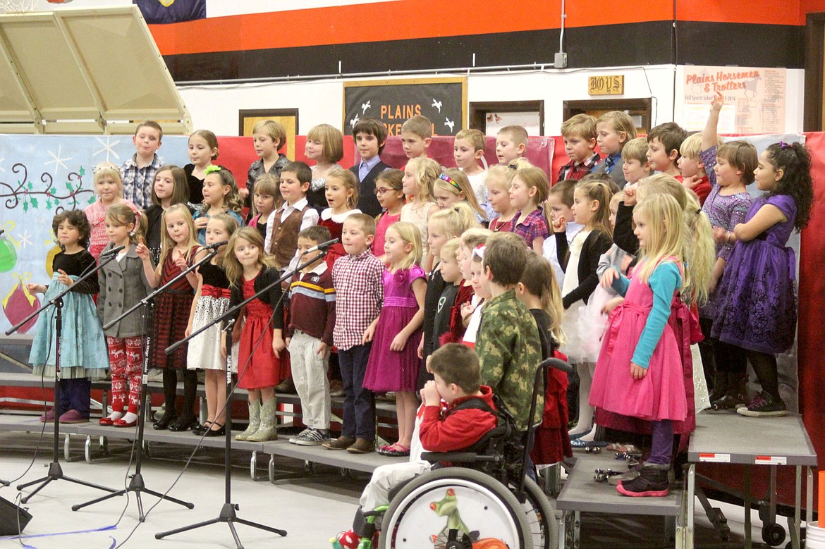 Plains kindergarteners and first graders join together for a rendition of Jingle Bells during the elementary school’s Christmas concert.