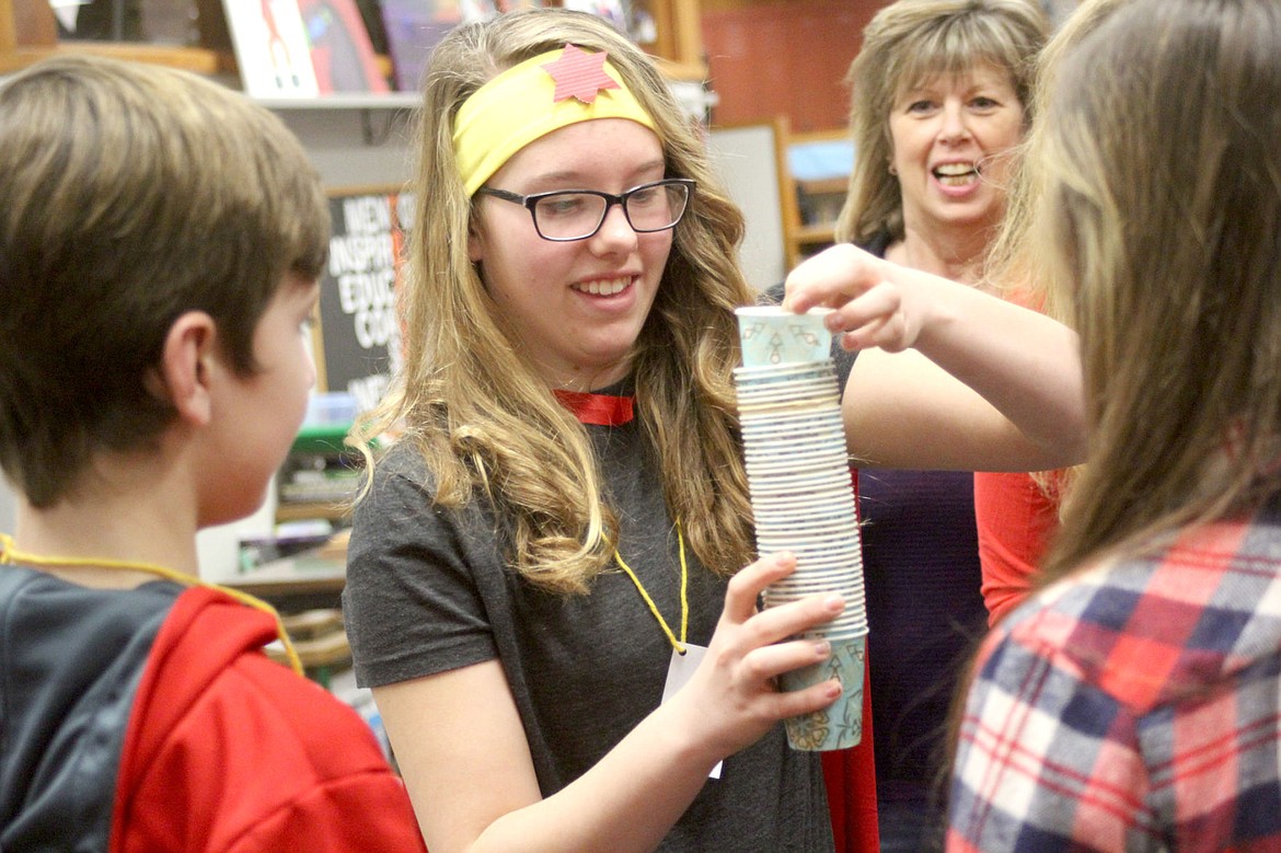 Dakota Butcher, from team Wonder Woman, moves cups from one end of a stack to the other during the Brain Bash at Plains School.