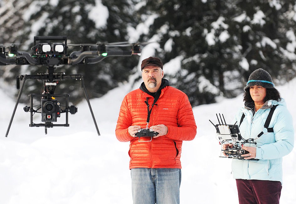 Jeff and Adele Scholl control the Freefly ALTA outside of their office on Wednesday. (Aaric Bryan/Daily Inter Lake)