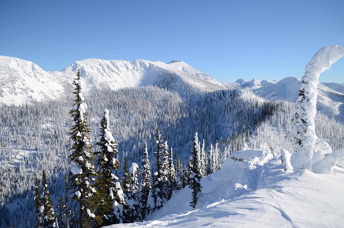A bluebird view of the Jewel Basin ridge, looking southeast toward Mount Aeneas in center frame. The area is popular with skiers and snowmobilers. Trekking to this point, Peak 6437, from Jewel Basin Road by snowshoe took approximately three hours. (Seaborn Larson/Daily Inter Lake)