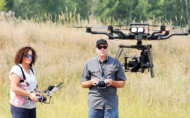 Adele Scholl controls the camera and Jeff Scholl flies the unmanned aircraft vehicle behind the Quadrocopter office on Tuesday, August 25, 2015. (Aaric Bryan/Daily Inter Lake)