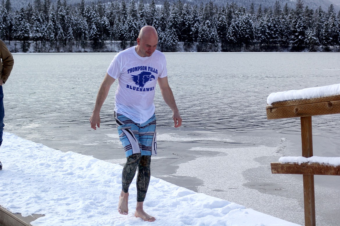 Jason Slater walks back to land after jumping in the Clark Fork River during the Polar Plunge.