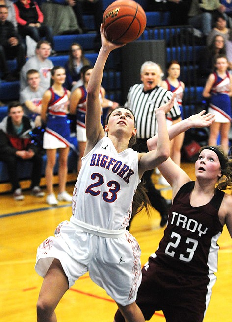 Valkyrie Mattie McAnally drives past Trojan Allie Brown for a basket during the first half in Bigfork on Friday. (Aaric Bryan/Daily Inter Lake)