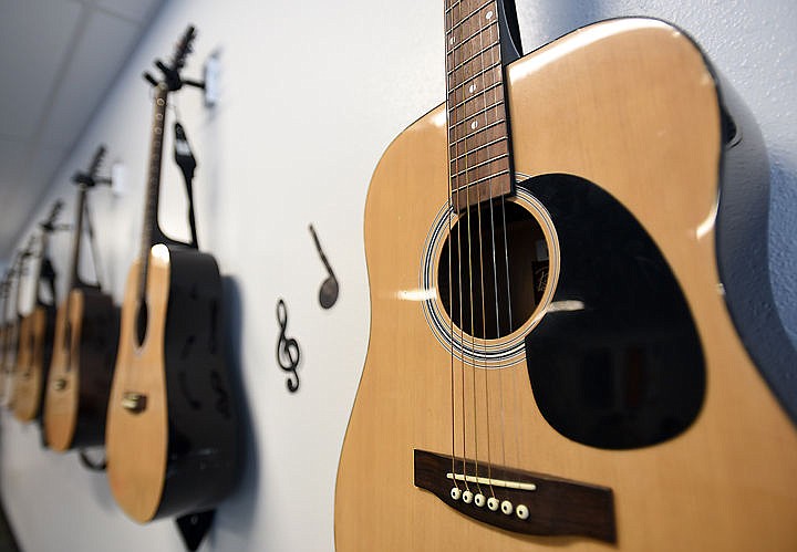 A row of guitars line the walls of the new music room at Kila School on Friday, January 8. (Brenda Ahearn/Daily Inter Lake)