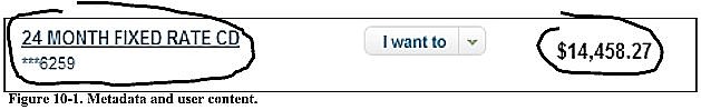 The information of “24 MONTH FIXED RATE CD ***6259” is data about data. It identifies account number 6259, which is a 24-month fixed rate certificate of deposit. The data itself, user content, is the value of the CD: “$14,458.27.”