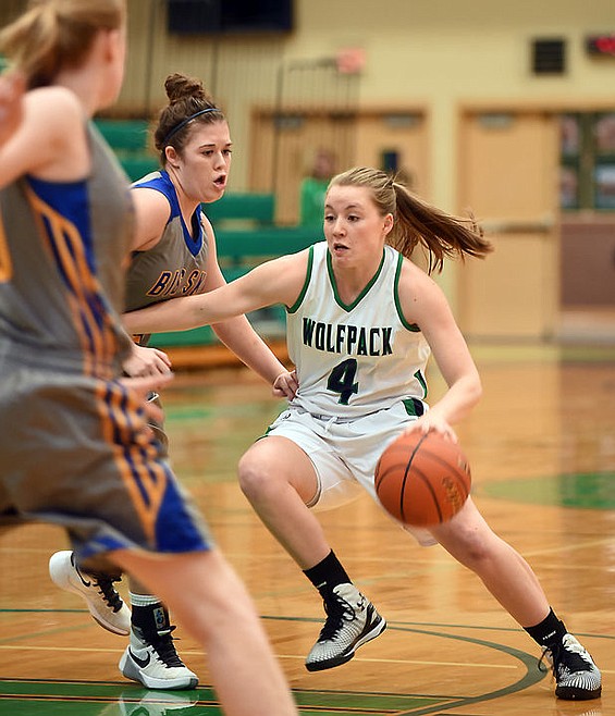 Glacier senior Hailee Bennett, 4, drives to the basket during Saturday's game against Big Sky. (Brenda Ahearn/Daily Inter Lake)