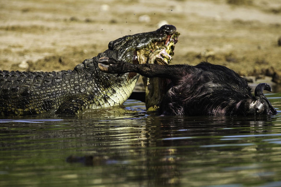 A crocodile feeds on a Cape Buffalo in the Chobe River.