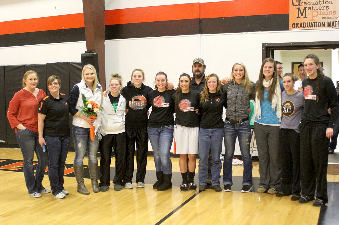 The members of the Plains track team for the last three years gather to celebrate their third state championship in a row during a Plains basketball game. The celebration also included the unveiling of the new 2015 state championship banner.