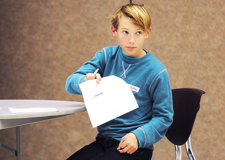 Eighth-grader Noah Golan shows his answer to the judges during the championship round of the Columbia Falls Junior High'g Geography Bee at the school on Tuesday. Golan got all the questions right to win his third straight geography bee. (Aaric Bryan/Daily Inter Lake).