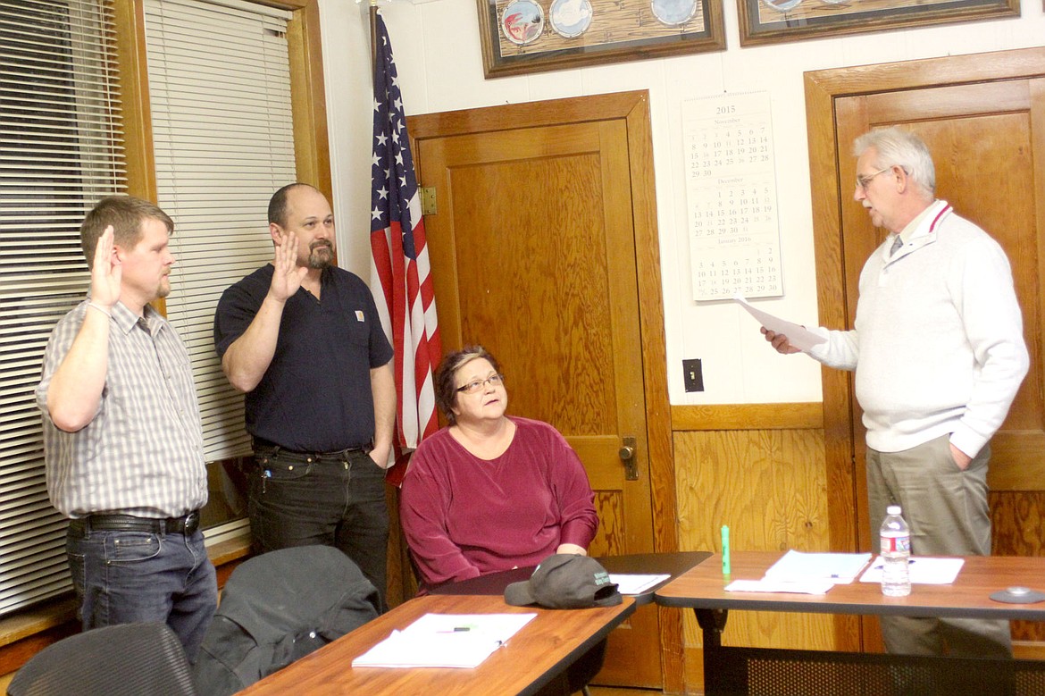 Mayor Greg Eitelberg swears in John Curry, Danny Rowan and Sandy Chenoweth as members of the Plains City Council during their January meeting.