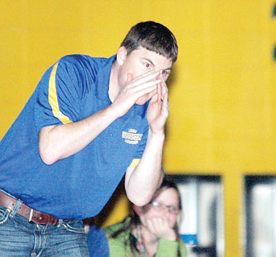 Coach Kelly Morford shouts words of encouragement to Clancy Gout during his match with Eureka's Joe Fehr Tuesday, Jan. 12.