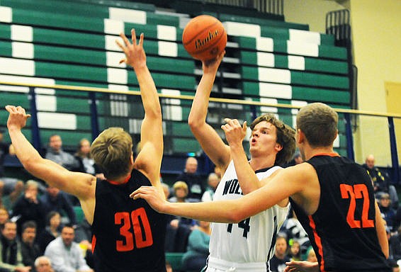 Glacier's Noah Lindsay puts up a shot over Frenchtown's Andrew King (30) and Austin Means (22) during the first quarter on Friday. (Aaric Bryan/Daily Inter Lake)