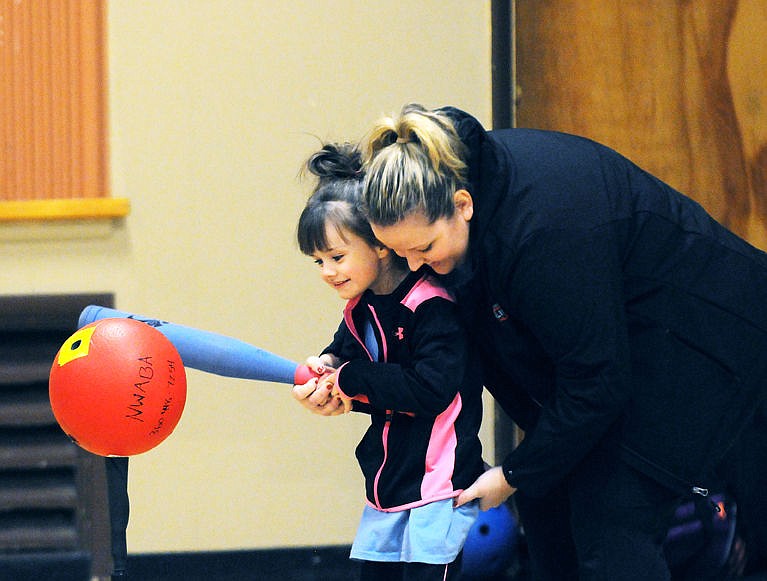 Stacy Gibbins, the director of programs for the NW Association for Blind Athletes, helps Hayden Sherman hit the ball during a game of beep ball for the Paralymic Experience Kalispell at the Peterson School on Saturday. The event was hosted by the NW Association for Blind Athletes and the Montana School for the Deaf and the Blind. (Aaric Bryan/Daily Inter Lake)