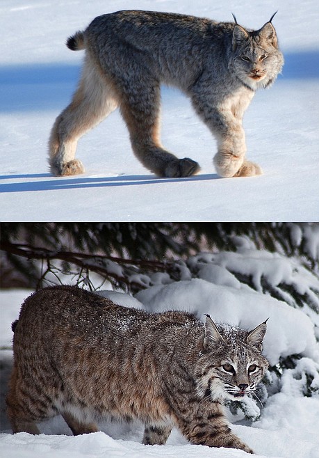 The Canada lynx is generally 30-35 inches long and weighs 14-31 pounds with grizzled gray fur. According to the U.S. Fish and Wildlife Service, "the lynx’s large, well-furred paws, long, black ear tufts, and short, black-tipped tail distinguish it from the bobcat." They are elusive, dine primarily on snowshoe hare, live in snowy, wooded areas and have been documented to live as long as 16 years in the wild.