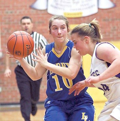 Libby's Ashley Walker looks to pass while being defended by Polson's Brenna Clarke Saturday night in Polson.