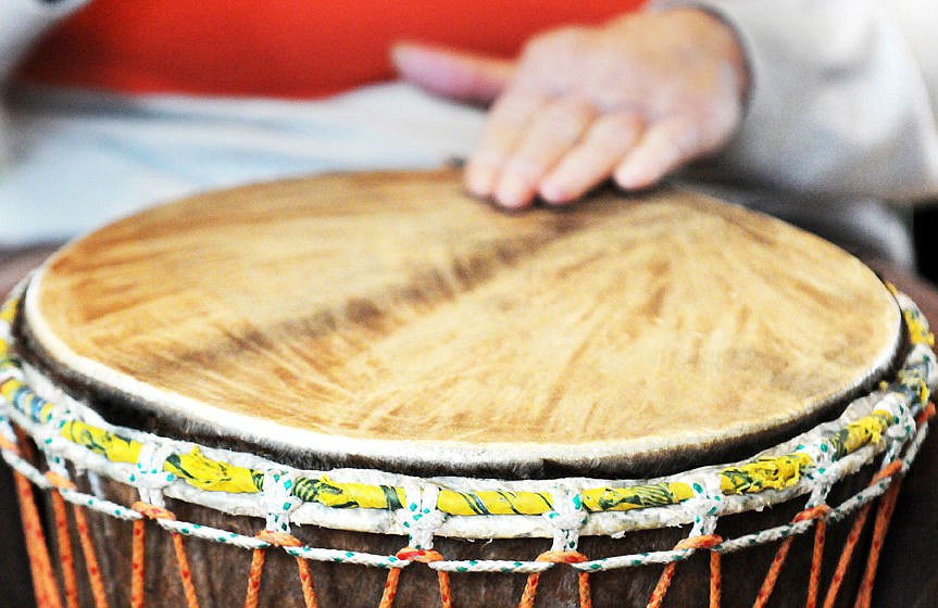 Nancy Gresham taps the drum during an African drum class. (Aaric Bryan/Daily Inter Lake)