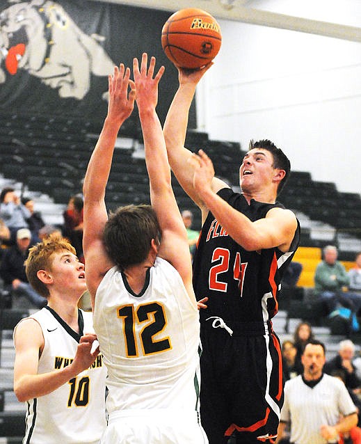 Flathead's C.J. Dugan sinks a basket over the Bulldogs' Matt Brewer (12) and Jacob Henry (10) to give Flathead an 18-13 lead at halftime in Whitefish on Tuesday. (Aaric Bryan/Daily Inter Lake)
