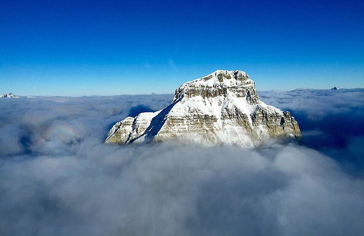 Kintla Peak in Glacier National Park juts above a sea of clouds in this aerial photo taken Jan. 9. The peak, one of six in Glacier that top 10,000 feet, is just south of Upper Kintla Lake in the North Fork. (Jordan White/Two Bear Air photo)